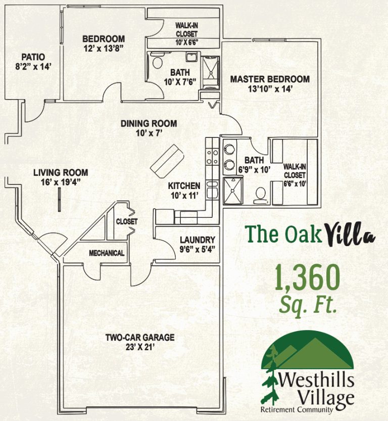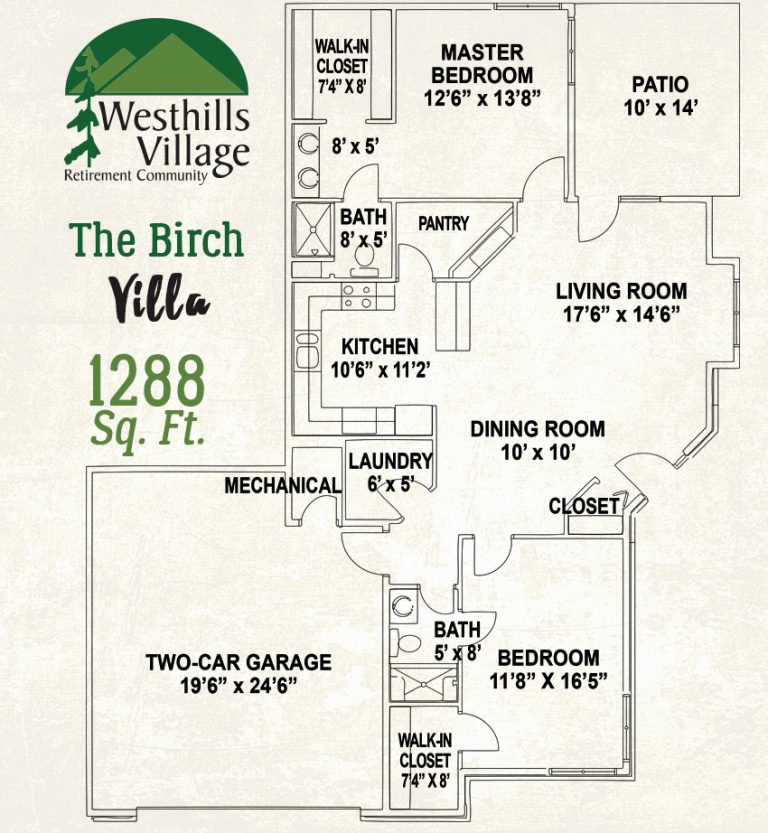 The Westhills Village Birch Villa features a large, open concept living room, dining room, and kitchen, and a large patio off the living room and bedroom. The fully-equipped kitchen features abundant cabinet space, a stove/oven, dishwasher, garbage disposal, pantry and microwave. You’ll be impressed by the spacious master bedroom with its walk-in closet, the master bathroom, and the attached two-car garage includes additional space for storage.The two bathrooms include a shower and tub, a sink, and plenty of light and storage. With plenty of space and amenities, this senior housing option offers convenience and comfort that will enhance your life.