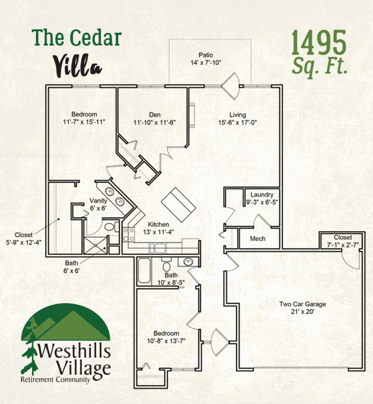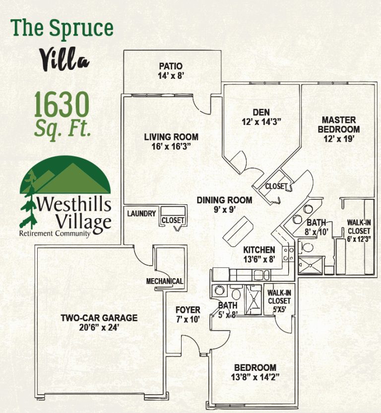 The Westhills Village Spruce Villa features a large, open concept living room, dining room, and kitchen. You’ll be impressed by the spacious master bedroom, walk-in closets, and master bathroom. You will enjoy a fully equipped kitchen featuring abundant cabinet space, a stove/oven, dishwasher, garbage disposal, and microwave. The two bathrooms include a shower and tub, a sink, and plenty of light and storage. An additional bedroom and den give plenty of living space, and closets abound. There is a nice patio off of the living room, and the two-car garage provides space for two vehicles and some storage in an extra closet. With plenty of space and amenities, this senior housing option offers convenience and comfort that will enhance your life.