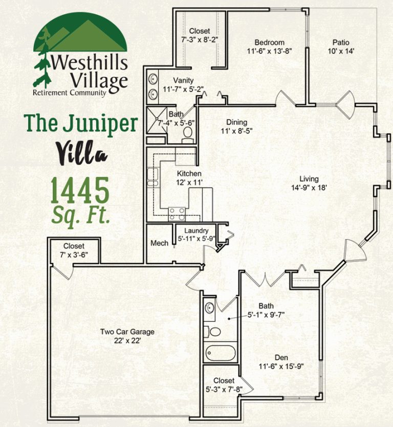 The Westhills Village Juniper Villa features a large, open concept living room, dining room, and kitchen. You’ll be impressed by the spacious master bedroom, walk-in closet, and master bathroom. You will enjoy a fully-equipped kitchen featuring abundant cabinet space, a stove/oven, dishwasher, garbage disposal, and microwave. The two bathrooms include a shower and tub, a sink, and plenty of light and storage; additional den space adds to your comfort. The attached two-car garage includes additional space for storage. There is a nice patio off the living room and master bedroom. With plenty of space and amenities, this senior housing option offers convenience and comfort that will enhance your life.
