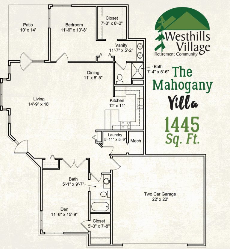 The Westhills Village Mahogany Villa features a large, open concept living room, dining room, and kitchen. You’ll be impressed by the spacious master bedroom, walk-in closet and master bathroom and will enjoy the fully-equipped kitchen featuring abundant cabinet space, a stove/oven, dishwasher, garbage disposal, and microwave. The two bathrooms include a shower and tub, a sink, and plenty of light and storage. A nice patio off the living room and master bedroom provides a personal outdoor area, and a den area adds to your comfort. The attached two-car garage includes additional space for storage. With plenty of space and amenities, this senior housing option offers convenience and comfort that will enhance your life.