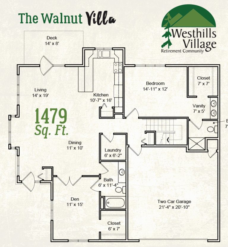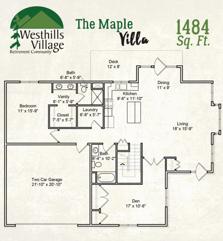 The Westhills Village Maple Villa features a large, open concept living room, dining room and kitchen. You’ll be impressed by the spacious master bedroom with its walk-in closet and master bathroom. You will enjoy a fully-equipped kitchen featuring abundant cabinet space, a stove/oven, dishwasher, garbage disposal, and microwave. The two bathrooms include a shower and tub, a sink, and plenty of light and storage. There is a nice deck off of the kitchen, as well as additional den space for your comfort. The attached two-car garage includes additional space for storage. With plenty of space and amenities, this senior housing option offers convenience and comfort that will enhance your life.