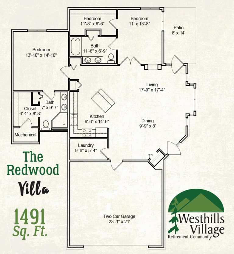 The Westhills Village Willow Villa features a large, open concept living room, dining room and kitchen when you enter the villa. You’ll be impressed by the spacious master bedroom, walk-in closet and master bathroom. The two-car garage provides space for two vehicles and some storage in an extra closet space. There is a nice patio off of the living room and master bedroom. You will enjoy a fully equipped kitchen featuring abundant cabinet space, stove/oven, dishwasher, garbage disposal, and microwave. A 2nd bedroom allows for extra living space and you’ll find lots of closet space in this Villa. The bathrooms include a shower and tub, a sink, and plenty of light and storage. With plenty of space and amenities, this senior housing option offers convenience and comfort that will enhance your life.